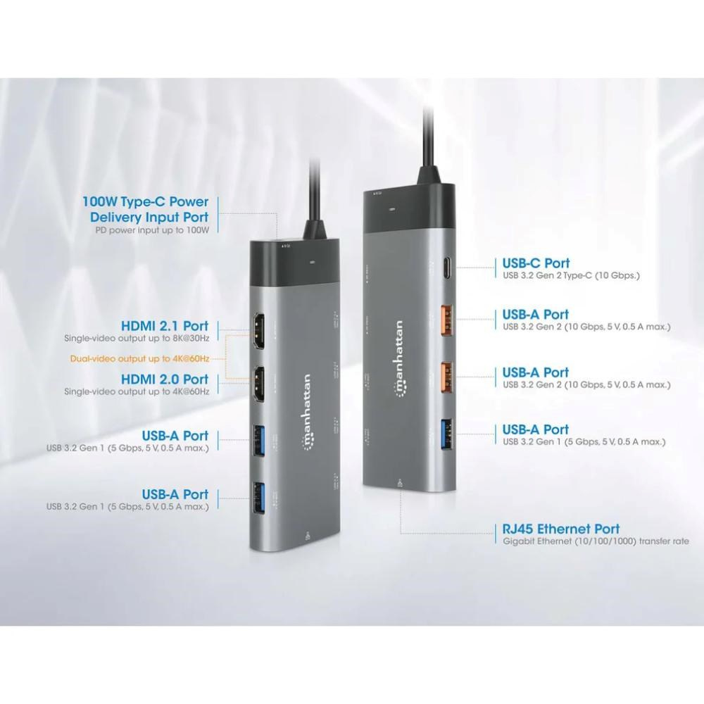 MANHATTAN Dokovací stanice USB-C 10v1, 2xHDMI, 2xUSB-C, 5xUSB, 1xRJ45, šedá