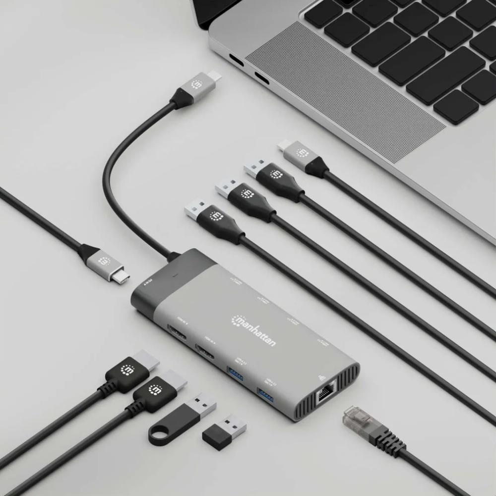 Zvýšte svoju produktivitu s počítačom PC, Mac alebo tabletom pomocou tejto vysoko univerzálnej dockovacej stanice od spoločnosti Manhattan. Pomôže vám vykonávať viac úloh na dvoch UHD HDMI monitoroch súčasne. Väčšinu potrebných vecí v oblasti konektivity tiež uspokojíte vďaka piatim portom SuperSpeed USB-A, ktoré rýchlo pripoja a nabijú kompatibilné zariadenia, a tiež portu SuperSpeed USB-C pre prenos dát pre pripojenie zariadení s vysokou priepustnosťou. Priložený port Ethernet s automatickou detekciou 10/100/1000 vám pomôže pripojiť sa k káblovej sieti a vstup pre napájanie až 100 W Power Delivery (PD) pomôže napájať všetky zariadenia USB, ktoré sa k doku pripojia.