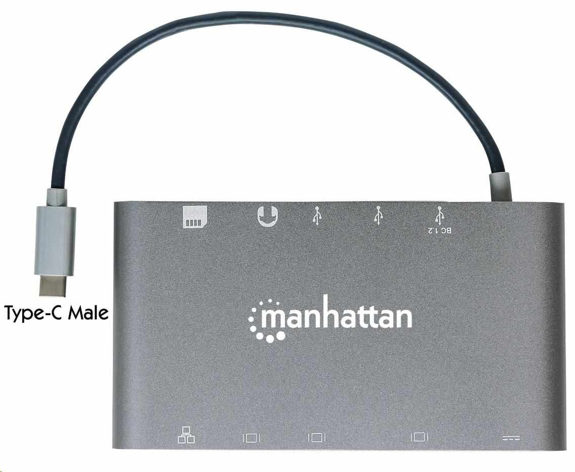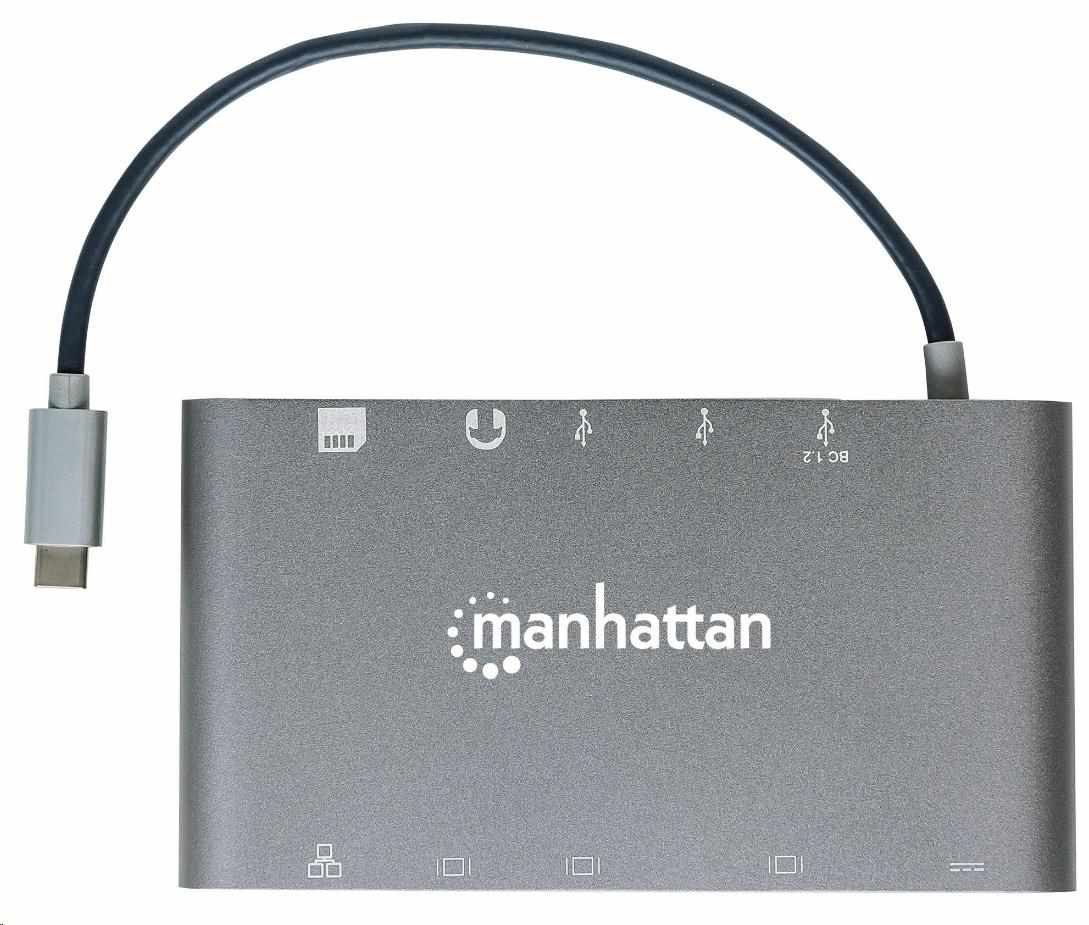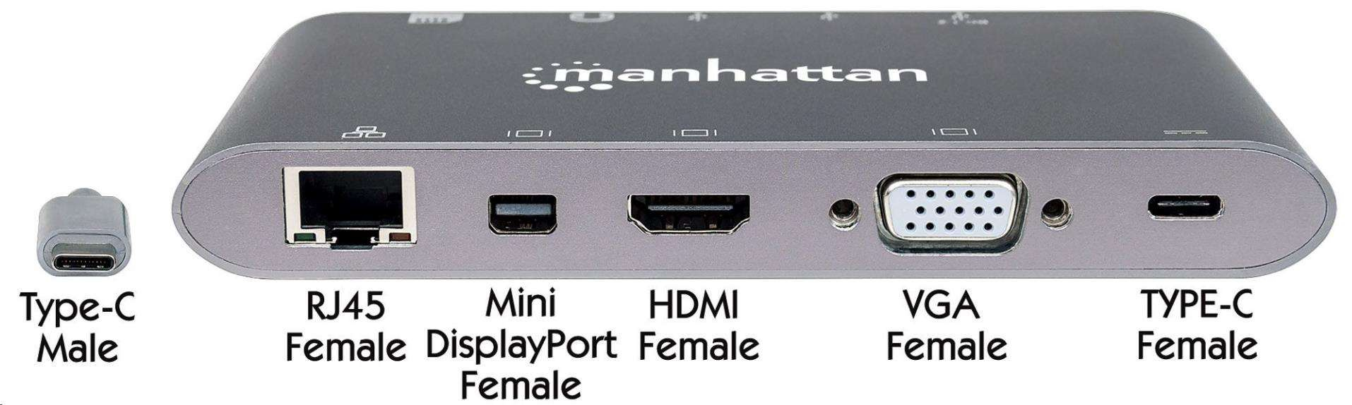 MANHATTAN Dokovacia stanica USB-C na HDMI, Mini DP, VGA, 3xUSB 3.0, port USB-C PD, RJ 45, čítačka kariet, 3,5 mm
