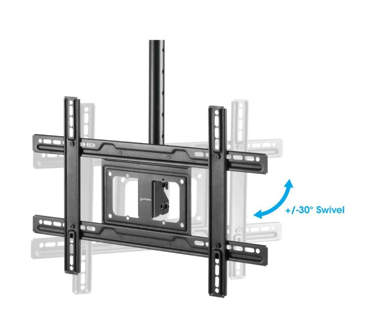 Zlepšite uhol pohľadu, keď je miesto na stene a podlahe obmedzené alebo nie je možné inštalovať televízor nízko nad podlahou. Tento stropný držiak na televízor Manhattan pojme LCD, LED alebo plazmový displej s uhlopriečkou 37" až 80" a hmotnosťou až 50 kg. Jeho práškovo lakovaná, odolná oceľová konštrukcia zabezpečuje bezpečnú a spoľahlivú inštaláciu nad hlavou.
