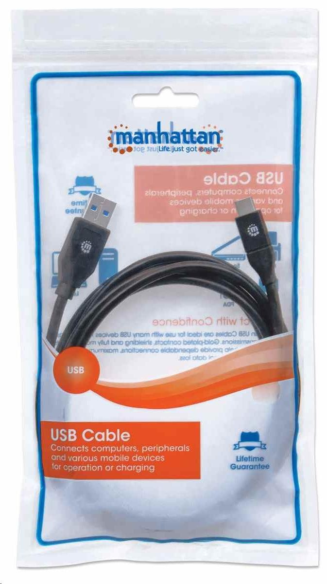 Káble Manhattan SuperSpeed USB typu C umožňujú jednoduché pripojenie periférnych zariadení a príslušenstva USB typu A k portom zariadení typu C. Tieto káble sú ideálne na použitie s akýmkoľvek zariadením USB typu A typu plug-and-play a podporujú prenos dát rýchlosťou až 5 Gb/s v systémoch Windows a Mac pre rýchle a spoľahlivé prenosy a prúd až do 3 A. Poniklované kontakty, tienenie a plne tvarované pätky s odľahčením ťahu pomáhajú zabezpečiť spoľahlivé pripojenie, maximálnu vodivosť a minimálnu stratu dát pri zníženom rušení EMI.