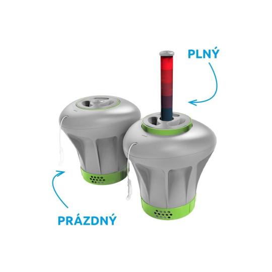 Veľký dávkovač chlóru má integrovaný farebný ukazovateľ, ktorý vás upozorní na potrebu doplniť nové tablety. Indikátor postupne klesá, keď sa chemikália rozpúšťa.