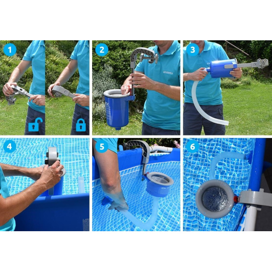 Skimmer na zbieranie nečistôt z hladiny bazéna. Skimmer sa pripája na priechod steny bazéna pomocou skrutkového adaptéru a hadice a zavesí sa na stenu alebo límec bazénu. V balení sú adaptéry na zavesenie na bazény s nafukovacím lemom a na bazény s kovovým rámom. Montáž je veľmi jednoduchá a zvládne ju prakticky každý. Vďaka skimmeru sa z hladín odstraňujú nečistoty, ktoré potom zachytí filtrácia.