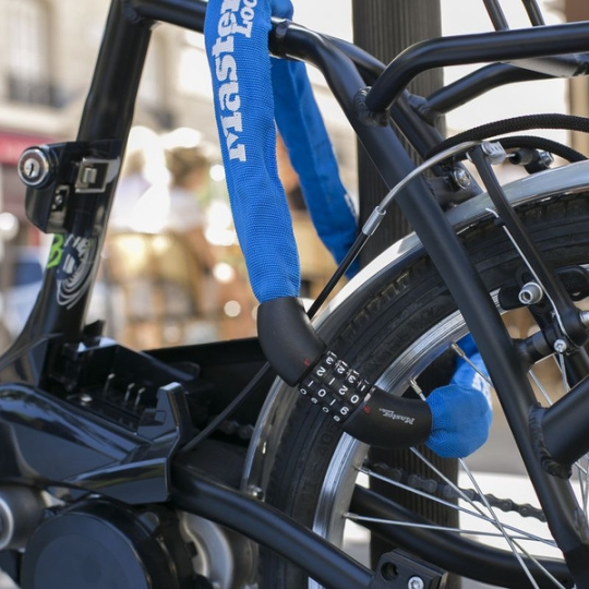 Posilnený oceľový reťaz s integrovaným kombinovaným zámkom je 90 cm dlhý a obsahuje oceľové spojky s priemerom 8 mm, ktoré odolávajú rezaniu. Nylonový kryt reťaze zabraňuje poškriabaniu. Zámok obsahuje resetovateľnú kombináciu 4 číslic.