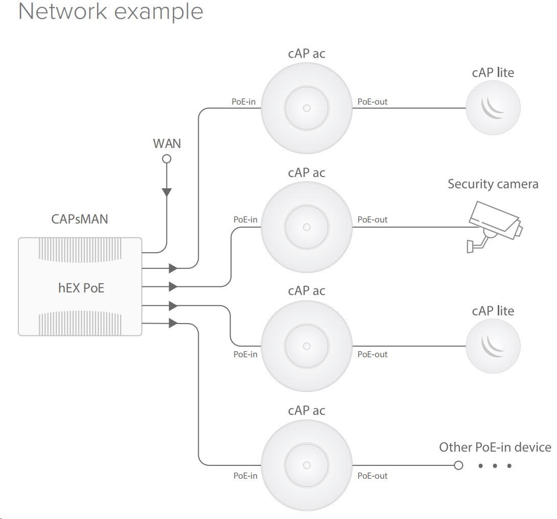 cAP ac je dvojpásmový prístupový bod (2.4+5GHz) s podporou PoE podľa 802.3af/at. Má dve gigabitové.ethernetové porty, z ktorých prvý slúži ako napájací vstup (podporuje aktívne PoE 802.3af/at) a druhý ako výstup pre inú jednotku (podporuje len pasívne PoE do 57 V). Hoci jednotka podporuje režim opakovača, je možné pripojiť ďalší prístupový bod a ethenet.kábel do portu 2, kde bude napájaný pasívnym PoE, alebo môže byť pripojená IP kamera alebo iné IP zariadenie podporujúce pasívne PoE.
