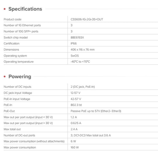 GPERx6 umožňuje rozšířit napájení a optické vlákno společně pomocí jediného hybridního kabelu. Na druhém konci jej GPERx6 přehledně rozdělí: • SFP+ pro další dálkové uplinky • PoE-out pro napájení kamer nebo přístupových bodů • DC výstupy pro zařízení IoT nebo specializovaná zařízení GPERx6 eliminuje problémy s aspekty nepříznivých meteo podmínek při venovních instalacích, zjednodušuje nasazení a nabízí: • 3 gigabitové ethernetové porty s PoE-in (#1) a PoE-out (#2 a #3) • 3× 10G SFP+ klece pro dálkové optické kabely • 3 DC výstupy pro zařízení, která nepoužívají PoE, například IoT zařízení • Odolný kryt IP66 s praktickým montážním hardwarem • Speciální 10G switch čip (testovaný v oblíbených ISP zařízeních, jako je netPower Lite 7R) Tedy řešení, umožňující správu napájení a dat na dlouhé vzdálenosti (1–2 km) i v těch nejnáročnějších scénářích. Konktétní případové nasazení: Jedním z možných použití GPERx6 je možnost přerušit stávající optické vedení a připojit zákazníky podél trasy (proto jsou k dispozici 3 porty SFP+ – vstupní vedení, zákaznické místo, výstupní vedení). Jedná se o častý problém, kdy optické vedení vede podél nemovitosti, ale poskytovatel internetových služeb odmítá připojit konkrétní nemovitost, protože nechce přerušit optické vedení. Výhoda hybridních kabelů Díky hybridním optickým a metalice se GPERx6 stává životně důležitým zdrojem energie a dat: • Optická vlákna přenášejí vaše vysokorychlostní uplinky. • Měděné vodiče dodávají stejnosměrný proud. Na druhém konci GPERx6 vše rozděluje: ° SFP+ uplinky pro data. ° PoE-out pro kamery nebo přístupové body. ° DC-out pro zařízení IoT nebo speciální hardware Podrobné technické specifikace: Product code: CSS606-1G-2Gi-3S+OUT Number of 1G Ethernet ports: 3 Number of 10G SFP+ ports: 3 Switch chip model: 88E6193X Certification: IP66 Dimensions: 406 x 116 x 76 mm Operating system: SwOS Operating temparature: -40°C to +70°C Napájení: Number of DC inputs: 2 (DC jack, PoE-In) DC jack input Voltage: 12-57 V PoE-In input Voltage: 42-57 V PoE-In: 802.3 bt PoE-Out: Passive PoE up to 57V (Ether2- Ether3) Max out per port output (input < 30 V): 1.2 A Max out per port output (input > 30 V): 0.625 A Max total out: 2.4 A Number of DC-out ports: 3, DC1-DC3 Max total out 3.6 A Max power consumption (without attachments): 6 W Max power consumption: 160 W Upozornění: Výrobce MIKROTIK nevztahuje záruku na zařízení poškozená přepětím. Zařízení je třeba na vstupech adekvátně chránit proti indukovanému elektrostatickému přepětí či přepěťovým špičkám na silovém vedení. Při venkovních instalacích je třeba používat stíněnou kabeláž (FTP/SFTP), příslušné přepěťové ochrany (pokud nejsou integrovány) a provést korektní a efektivní uzemnění. Zařízení vždy provozujte s poslední výrobcem publikovanou verzí (výrobcem označenou "Stable") operačního systému RouterOS/SwOS. Taková verze garantuje nejoptimálnější funčknost, obsahuje opravené chyby z verzí předchozích a výkonová vylepšení. .