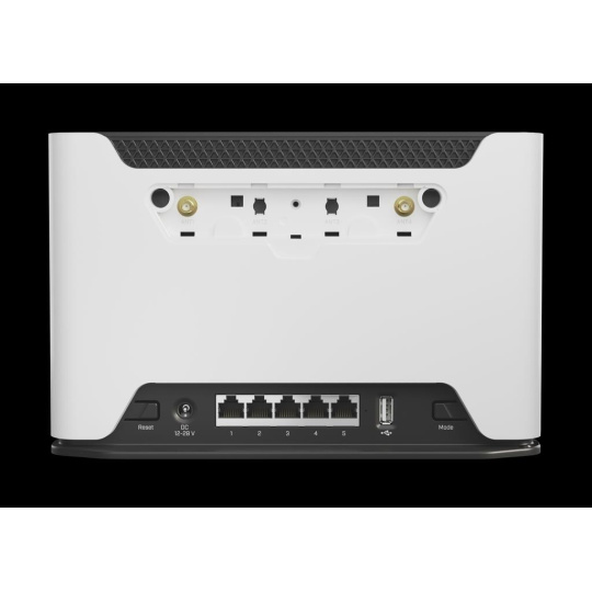Product code D53G-5HacD2HnD-TC&FG621-EA CPU Quad-Core IPQ-4019 716 MHz CPU architecture ARM 32bit Size of RAM 256 MB RAM type DDR3L Storage 16 MB, Flash Number of 1G Ethernet ports 5 USB port 1 (2.0 type A) Switch chip model IPQ-4019 Wireless interface model IPQ-4019 (2.4 GHz), IPQ-4019 (5 GHz) Wireless 2.4 GHz 802.11b/g/n dual-chain, 5 GHz 802.11a/n/ac dual-chain Antenna gain 2.4 GHz - 2 dBi, 5 GHz - 4 dBi LTE category 6 (300Mbit/s Downlink, 50Mbit/s Uplink) LTE modem FG621-EA TAC 86335904 MIMO DL 2x2 LTE FDD bands 1 (2100MHz) / 3 (1800MHz) / 5 (850MHz) / 7 (2600MHz) / 8 (900 MHz) / 20 (800MHz) / 28 (700MHz) Suitable for the EMEA/APAC/Australia regions. LTE TDD bands 38 (2600MHz) / 40 (2300MHz) / 41 (2500MHz) 3G Category R8 (42.2Mbps Downlink, 11.2Mbps Uplink) 3G Bands 1 (2100MHz) / 3 (1800MHz) / 5 (850MHz) / 8 (900MHz) Dimensions 240 x 156 x 44 mm Operating system RouterOS v7, License level 4 Operating temperature -40°C to +70°C Number of DC inputs 1 DC jack input Voltage 12-28 V Power adapter nominal voltage 24 V Power adapter nominal current 1.2 A Max power consumption without attachments 15 W Max power consumption 21 W.