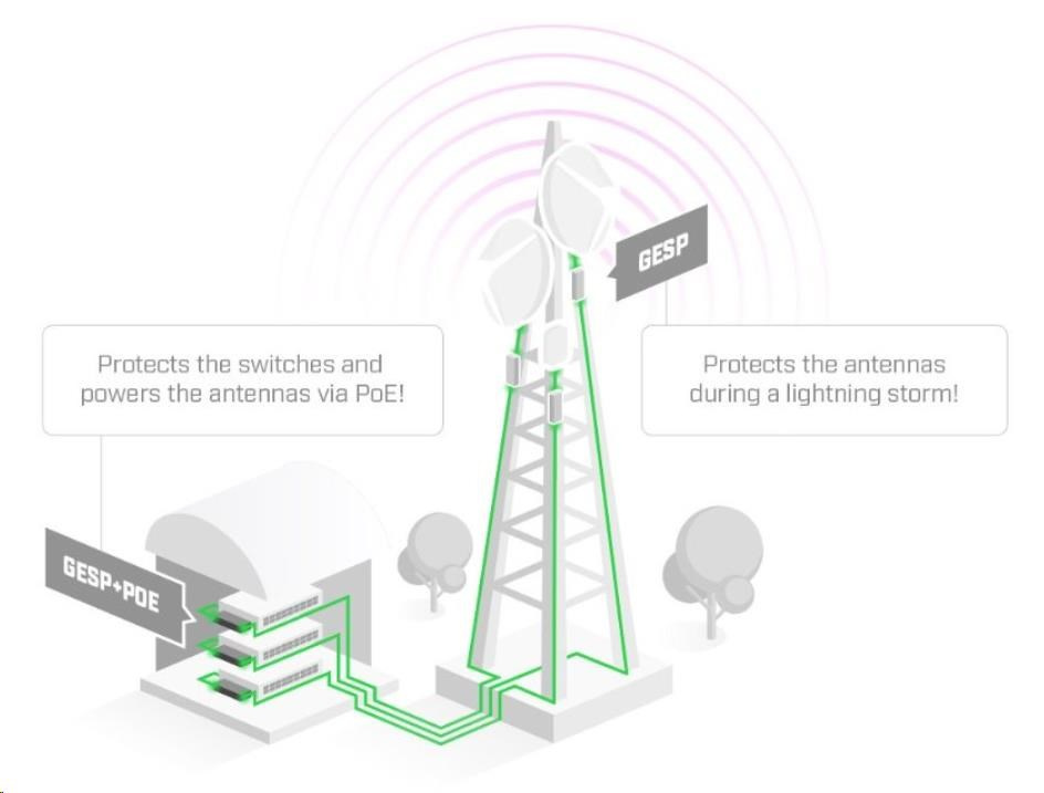 GESP+POE-IN je pasívny gigabitový injektor PoE s integrovanou prepäťovou ochranou Ethernetu na ochranu proti prepätiu s jedným ethernetovým portom na druhej strane vedeným káblom s konektorom RJ45 a uzemňovacím káblom ukončeným očkom. Táto verzia je určená na vnútorné použitie na porte prepínača alebo smerovača, ktorý smeruje do vonkajšej jednotky CPE.