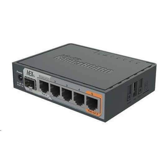 MikroTik RouterBOARD hEX S, 880MHz dvojjadrový CPU, 256MB RAM, 5x LAN, 1x SFP, PoE in/out, USB, microSD slot, vrátane. Licencia L4
