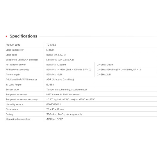 Konfigurovatelný senzorový tag LoRaWAN TG-LR82 je flexibilní a cenově výhodný nástroj pro sběr dat pro přijímání operačních rozhodnutí. Sledujte teplotu, vlhkost, pohyb a události pomocí konfigurovatelného senzorového tagu LoRaWAN, který je navržen pro nasazení v oblastech IoT. TG-LR82 kombinuje několik senzorů, inteligentní pravidla pro zpracování událostí a flexibilní profily reportování v jednom kompaktním zařízení. Toto usnadňuje monitorování prostředí, zařízení a logistiky na velké vzdálenosti. Je navržen pro bezproblémovou spolupráci s bránami MikroTik LR8 a dalšími moderními monitorovacími platformami. TG-LR82 kombinuje snímání okolního prostředí a pohybu s integrovaným zpracováním dat. Díky vysoce přesnému měření teploty je TG-LR82 obzvláště vhodný pro monitorování teplotně citlivého zboží a prostředí. Zařízení dokáže před odesláním telemetrických dat vypočítat průměrné hodnoty teploty a vlhkosti nebo vytvořit histogramy. Tím se snižuje zatížení sítě, přičemž zůstávají zachovány cenné informace o podmínkách v okolí. Automatizace: když se podmínky změní, senzor reaguje TG-LR82 podporuje více konfiguračních profilů a pravidel založených na událostech, což umožňuje zařízení automaticky se přizpůsobovat měnícím se podmínkám. To umožňuje výkonné monitorovací scénáře bez složité backendové logiky. TG-LR82 podporuje flexibilní konfiguraci prostřednictvím downlinků LoRaWAN. Generujte datové pakety pomocí specializovaného konfiguračního nástroje nebo integrujte s platformami, jako je The Things Network (TTN). Flexibilita v pásmu 2,4 GHz pro LoRa! TG-LR82 podporuje také 2,4 GHz LoRa, což umožňuje nasazení bez regionálních omezení frekvencí. Na rozdíl od sub-GHz pásem LoRa, která se liší podle regionu, lze 2,4 GHz LoRa používat globálně bez přepínání frekvencí. Typický dosah může dosáhnout přibližně 1,5 km, v závislosti na anténě brány a prostředí. Díky tomu je to praktická volba pro pohyblivá prostředí, jako jsou kontejnerové lodě nebo mezinárodní logistické systémy. Stejný princip lze uplatnit i v dalších monitorovacích scénářích: Při sledování prahových hodnot teploty nebo vlhkosti, detekci nárazu či volného pádu, monitorování polohy nebo náklonu, sledování aktivity zařízení a majetku a podobně. Integrovaný magnetický jazýčkový spínač umožňuje detekci otevření dveří či víka a umožňuje jednoduchou interakci se zařízením pomocí magnetu. Od chladírenských řetězců po skladovací prostory, od logistiky po environmentální výzkum – TG-LR82 se hodí pro celou řadu aplikací. Kompatibilita s monitorovacím systémem Data ze senzorů zařízení TG-LR82 lze vizualizovat a analyzovat pomocí moderních monitorovacích platforem, jako je Grafana. Díky podpoře kontejnerů v systému MikroTik RouterOS lze dashboardy Grafany rychle nasadit, což umožňuje vizualizaci telemetrických dat v reálném čase i analýzu historických údajů. Mezi příklady telemetrických údajů patří: • Vývoj teploty a vlhkosti • Stav orientace a aktivity • Histogramy okolního prostředí • Stav baterie a síla signálu Technické specifikace: Product code: TG-LR82 LoRa transceiver: LR1120 LoRa band: 868MHz / 2.4GHz Supported LoRaWAN protocol: LoRaWAN 1.0.4 Class A, B RF Transmit power: 868MHz: 10.5dBm 2.4GHz: 13dBm RF Receive sensitivity: 868MHz: -141dBm (BWL = 125kHz, SF = 12) 2.4GHz: -130dBm (BWL = 812kHz, SF = 12) Antenna gain: 868MHz: -4dBi 2.4GHz: 2dBi Additional LoRaWAN features: ADR (Adaptive Data Rate) ID LoRa Region: EU868 Sensor type: Temperature, humidity, accelerometer Temperature sensor: NIST traceable TMP116N sensor Temperature sensor accuracy: ±0.2°C typical (±0.3°C max) for -25°C to +85°C Humidity sensor: 0% -100% RH Dimensions: 76 x 45 x 19 mm Battery: 1100mAh LiMnO2, Non-replaceble Operating temperature: -10°C to +70°C *.