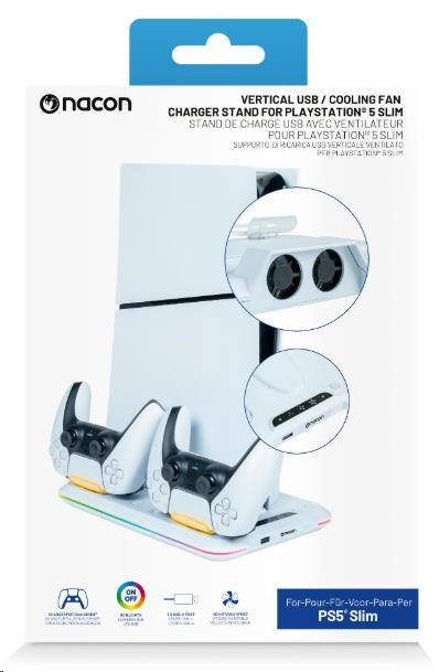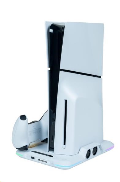 Umiestnite svoju hernú konzolu PlayStation 5 Slim na tento viacúčelový vertikálny základňa od spoločnosti Nacon. Ten je kompatibilný s diskovou aj digitálnou verziou tejto konzoly a okrem dvoch ventilátorov a jedného portu USB-A na nej nájdete aj dve kolísky slúžiace na nabíjanie herných ovládačov DualSense, pričom o stave ich nabíjania vás informuje farebné podsvietenie pod jednotlivými ovládačmi.