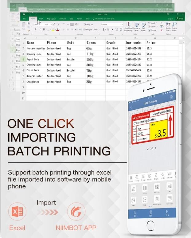 Model Niimbot B21S umožňuje tiež tlač priamo z PC. Do aplikácie Niimbot si tiež môžete naimportovať pripravené dáta z Excelu.