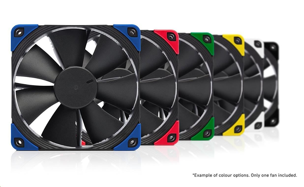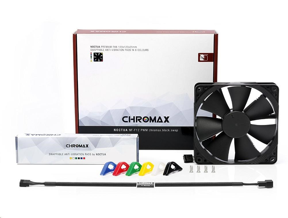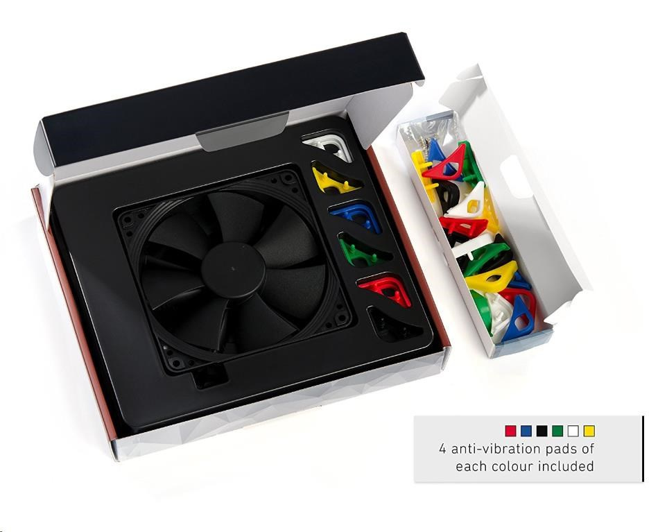 ventilátor, tichý, rozmer 120x120x25mm, hlučnosť 18.6 až 22.4dB, prietok 74.3 až 93.4 m3/h, 300 až 1500 otáčok, optimalizovaná geometria a povrch 7 lopatiek, SSO2, edícia Chromax - vymeniteľné farebné antivibračné podložky