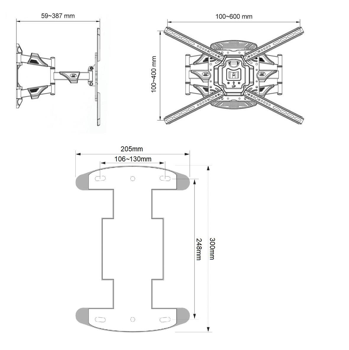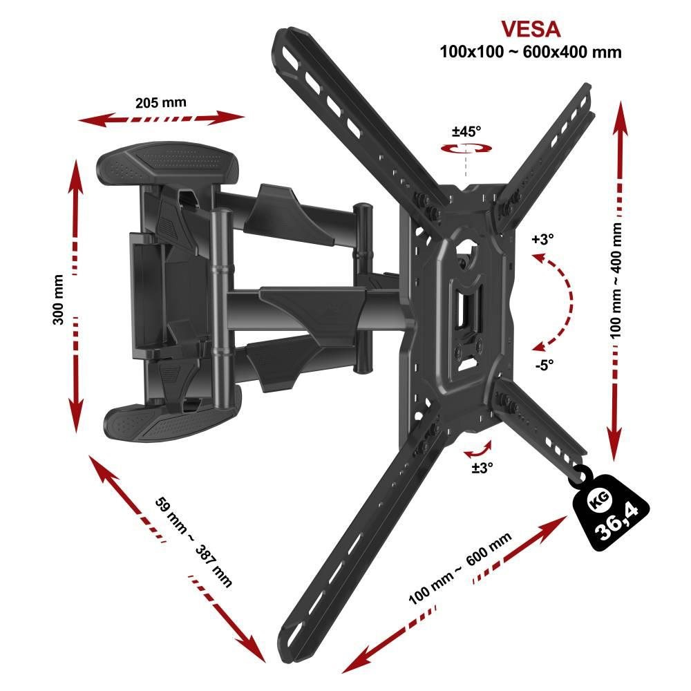 Profesionálny nástenný otočný sklopný držiak na televíziu NB NBP5 Držiak na TV 32-70", VESA 100*100 až 600*400, nosnosť 36,4kg, otočný +/-45°, sklopný +3°/-5°, výsuvný od 59 do 387mm, korekcia roviny, úchyty na káble, certifikovaný držiak TUV ISO9001 Celoocelový držiak pre úplne spoľahlivé a bezpečné upevnenie televízorov 32-70" na stenu. Držiak Vám umožní jednoduchú manipuláciu s televízorom - otáčanie do strán, naklápanie, vysúvanie a zasúvanie, úprava roviny. Ramena držiaka sú vybavené úchytkami na káble, nástenné uchytenie je osadené dizajnovými krytmi. Držiak podporuje VESA štandardy TV 100x100 až 400x400 a zavliecť môžete aj televízory s hmotnosťou 36kg. Veľmi kvalitný nástenný držiak na televízie, otočný sklopný a výsuvný NBP5 Technické údaje: nosnosť 36,4kg na televízie 32" až 70" podporuje VESA štandardy pre uchytenie TV 100x100 až 600x400 jednoduchá manipulácia s televízorom otáčanie do strán +/-45° naklápanie +3°/-5° vysúvanie a zasúvanie ku stene od 59mm až do 387mm úprava roviny televízie +/-3° úchyty na káble dizajnový kryt nástenného uchytenia extrémna pevnosť a úplná spoľahlivosť, vynikajúca kvalita celokovové prevedenie inštalačný materiál súčasťou balenia (hmoždinky, vruty, sada šroubov a podložiek) certifikovaný držiak TUV, ISO9001 farba čierna záruka 5 rokov Špičkový držiak na televíziu so snadným polohovaním televízie NBP5 TV držiak NBP5 podporuje VESA štandardy pre zavešenie televízorov: VESA 100*100 VESA 200*100 a 100*200 VESA 200*200 VESA 300*200 a 200*300 VESA 300*300 VESA 400*200 a 200*400 VESA 400*300 a 300*400 VESA 400*400 VESA 600*400 Držiak na televíziu NB NBP5 Balenie obsahuje súpravu inštalačného materiálu: 4ks skrutiek M4, M5 a M6 s dĺžkou 25mm 4ks skrutiek M8 s dĺžkou 30mm 4ks podložiek a 4ks distančných válečkov 1ks kľúča 10mm 4ks vrutov do hmoždinkov 7x70mm 4ks hmoždinkov (do tehly alebo betónu) Ak skrutky uvedené vyššie v balení nie sú vhodné na upevnenie Vašej televízie, je nutné, aby ste si skrutky v požadovanej dĺžke a priemere zakúpili sami - bohužiaľ výrobcovia TV používajú rôzne priemery a dĺžky.