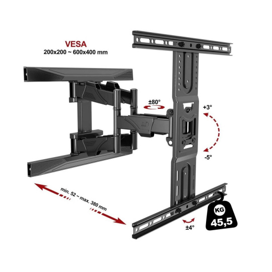 Kvalitný držiak na Tv NB DF600-P6 Kvalitný polohovateľný držiak na Tv 43" až 75", výsuvný 52-380mm, otáčanie do strán +/-60°, sklápačka +3°/-5°, VESA 200x200 až 600x400, nosnosť 45,5kg Otočný držiak televízie, jednoduchá inštalácia na stenu, veľmi kvalitná spoľahlivá konštrukcia. Držiak Tv NB DF600-P6 je ideálny na televízie s hmotnosťou do 45kg a VESA štandardmi od 200x200 do 600x400, veľkosť Tv by mala byť ideálne v rozmedzí 43" až 75". Možnosť vysúvania Tv od steny do vzdialenosti až 38cm a mierneho sklápenia Tv +3° až -5° a otáčania do strán až +/- 60°. V prípade nerovností na stene je možné rovinu televízie upraviť +/- 4°. Farebné prevedenie čierne, balenie vrátane montážneho materiálu, záruka 5 rokov. Vynikajúci nástenný držiak na otáčanie televízie NB DF600-P6 Technické údaje: nosnosť držiaka 45,5kg ideálny na Tv s uhlopriečkou 43" až 75" podpora VESA štandardov 200x200 až 600x400 nastavenie vzdialenosti od steny 52 až 380mm otočenie Tv do strán až +/- 60° možnosť sklápať Tv +3° až -5° regulácia roviny obrazovky +/- 4° úchyty na káble dizajnové krytky nástenného úchytu špičková, veľmi pevná a spoľahlivá konštrukcia materiál oceľ záruka 5 rokov Široká škála polohovania televízie na držiaku Tv NB DF600-P6 Držiak DF600-P6 podporuje VESA štandardy: VESA 100x200 VESA 200x200 VESA 300x200 a 200x300 VESA 300x300 VESA 400x200 a 200x400 VESA 400x300 a 300x400 VESA 400x400 VESA 600x400 Výborný držiak so spoľahlivou konštrukciou bez vôlí a bezúdržbovým prevedením čepov v kĺboch držiaku. Držiak DF600-P6 je vhodný na všetky televízory s hmotnosťou do 45,5kg, ktoré podporujú ktorýkoľvek z vyššie uvedených VESA štandardov.