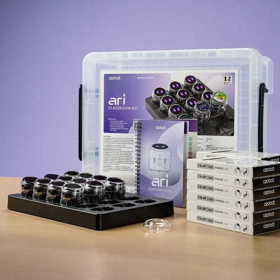 Vo školskej sade okrem 12 robotov Ari a nabíjacej stanice nájdete aj súbor aktivít, ktoré vám pomôžu s prvými krôčikmi. Nechýba ani 12 sad umývateľných fixiek s dvojitým hrotom, aby ste mohli rovno začať kresliť farebné kódy a vlastné spletité dráhy. Šírka stopy popisovačov je prispôsobená priamo senzorom malého robota. Ten sa tak lepšie orientuje na vašich trasách a odbočkách a nevyžaduje tak často kalibráciu. Táto výbava, bez ktorej sa na začiatku so študentmi nezaobídete, je dodávaná pekne pohromade v priestrannom úložnom boxe.
