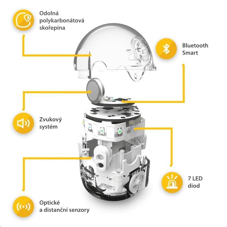 Privítajte Ozobota Evo! Vďaka vlastnej inteligencii je síce trochu neposedný, ale stále roztomilý a hlavne veľmi spoločenský. Nielenže neustále trousi niečo chytré svojim legračným hlásikom a pritom neprestáva blikať súborom farebných LED, komunikuje aj cez Bluetooth 4.0 a je možné ho diaľkovo ovládať z bezplatnej aplikácie pre chytré telefóny a tablety. Presne vykonané pohyby a zmeny farieb alebo zvukov je možné ukladať a tiež si prispôsobiť svojho malého robotika na mieru. Navyše každý deň aplikácia prináša ďalšie výzvy a odomyka lákavé odmeny.