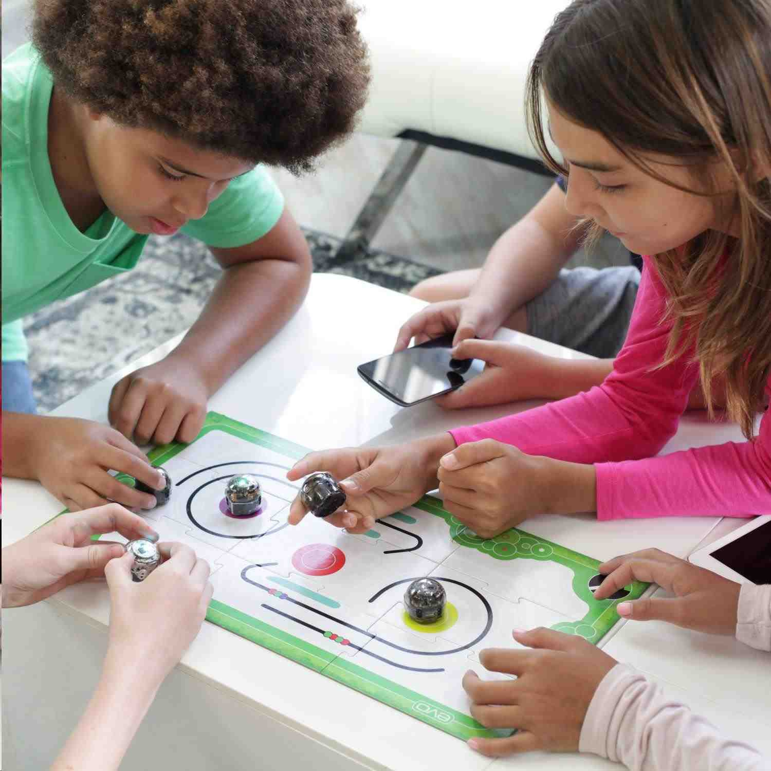 Ozobot Evo, skladacia herná plocha, ochranný skin, 4 farebné fixky, cestovné vrecúško, napájací kábel (micro USB)