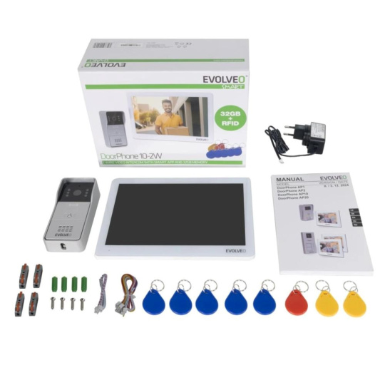 Balíček obsahuje všetko potrebné: vonkajšiu jednotku s kamerou a RFID čítačkou, vnútorný dotykový monitor s Wi-Fi, montážny materiál, napájací adaptér, prepojovacie káble aj základnú sadu RFID kariet. A samozrejme aj prehľadný návod na použitie. Máte tak k dispozícii všetko, čo potrebujete na vytvorenie moderného a bezpečného vstupného systému do vášho domu.