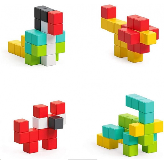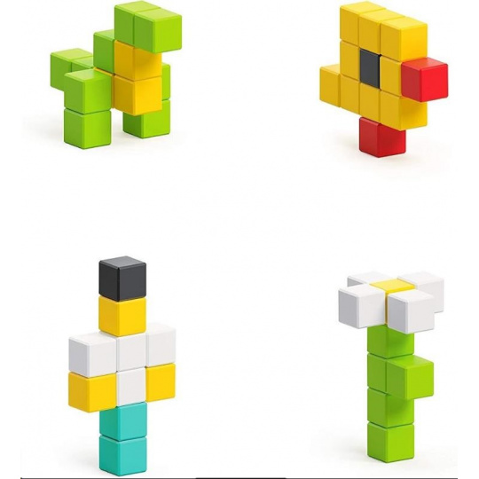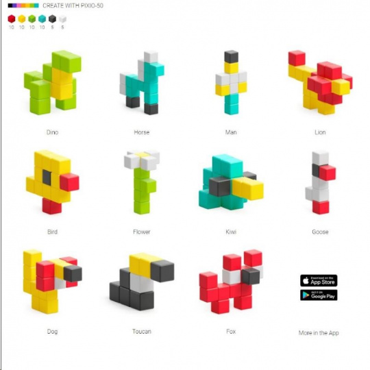 Každý z magnetických blokov PIXIO je kocka s rozmermi 8x8x8mm. Vo vnútri je 6 malých magnetov s hmotnosťou menšou ako 1 g. Šikovný a jedinečný dizajn magnetov dáva nekonečné možnosti skladania vzorov – neexistuje žiadny nesprávny spôsob stavania a tvorby, pretože ide len o kreativitu, predstavivosť a zručnosť tvorcu. Všetky modely PIXIO sú navzájom kompatibilné.