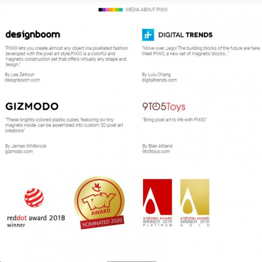 PIXIO je držiteľom viacerých prestížnych ocenení ako Red Dot Award, TOY AWARD, A ´DESIGN AWARD Gold a A ´DESIGN AWARD Platinum.