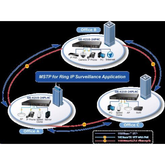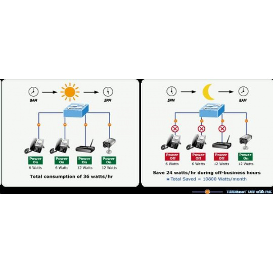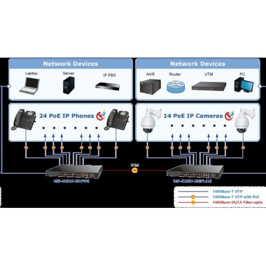 Gigabitový spravovateľný prepínač s portami PoE (napájanie cez ethernet) na centralizované napájanie zariadení cez ethernet, ako sú IP kamery, prvky WiFi alebo telefóny VOIP. Zariadenie je vhodné na inštaláciu do kancelárskych alebo prezentačných priestorov. Je vhodný aj pre aplikácie v miestnych rozvádzačoch, pripojenie je možné realizovať pomocou optických portov SFP. Bezpečnú správu zabezpečuje šifrovaná webová správa alebo protokol SNMPv3. Pripojenia koncových používateľov môžu byť zabezpečené pravidlami ACL/MAC alebo možnou autorizáciou na serveri RADIUS/TACACS. Vlastnosti: - 28 portov 1000Base-T, prepínanie, plný duplex (1000/2000 Mb/s), automatické vyjednávanie (10/100/1000 Mb/s) - 24x zabudované injektory PoE 802.3at, každý injektor do 30 W/port; celkový max. napájanie až 440 W - 4x SFP zdieľané s metalickým (25-28), 100/1000Base-X, pre inštaláciu optických modulov mini-GBIC s označením MFB a MGB - Auto-MDI/MDI-X, automatická detekcia priameho kríženia kábla aj pre 10/100 Mbps - ESD ochrana na všetkých portoch do 2kV DC - 8k MAC adries, 4,1MB buffer - priepustnosť: 52Gbps zbernica, 42Mp/s dáta (64B) - podpora prenosu Jumbo frame 10KB - správa: WEB / SNMPv3 / telnet / konzola; podpora SSL/SSH - podpora protokolov IPv4/IPv6 - VLAN IEEE 802.1Q, až 256 skupín, až 4094 VLAN ID; protokolové, VoIP a privátne VLAN - LACP agregácia portov 802.3ad, až 8 skupín po 8 portoch - QoS 8 front, klasifikácia podľa prevádzky, váženého priemeru alebo značky VLAN - Protokol Spanning tree: STP IEEE 802.1D / RSTP IEEE 802.1w / MSTP IEEE 802.1s - IGMPv3 snooping, Querier, až 256 multicastových skupín - zrkadlenie portov-port mirroring TX/RX/TX+RX/multiple na port - zabezpečenie klienta: zoznam riadenia prístupu (ACL), statická tabuľka MAC pre autorizované zariadenia, autorizácia RADIUS/TACACS+, DHCP snooping, pripojenie IP+MAC na port - ochrana proti útokom DoS - sústava indikátorov LED pre diagnostiku prevádzky - tepelná ochrana proti prehriatiu - rozmery: (440 x 300 x 44,5)mm, montáž 19"/1U - hmotnosť 4,8 kg - prevádzková teplota: 0-50 °C - interný zdroj striedavého prúdu 110-240V/50-60Hz, vlastná spotreba cca 30W..