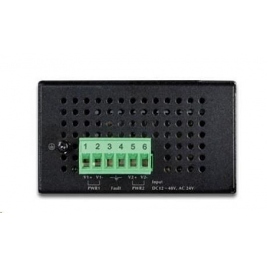 duálne napájanie v rozsahu 12-48 V DC / 24 V AC, krytie IP30, hliníkové puzdro, prevádzková teplota -40 ~ 75 °C. Ochrana proti prepätiu ESD do 6 kV. Montáž na lištu DIN alebo priama montáž na stenu.