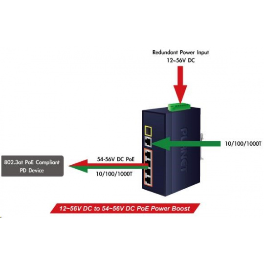Priemyselný prepínač ponúka päť portov RJ-45 10/100/1000Base-T, z ktorých štyri podporujú napájanie PoE+ až do 36 W na port, a 1 slot SFP (1000Base-SX/LX/BX) kompatibilný so 100Base-FX. Vďaka kovovému puzdru s certifikátom IP40 odoláva vysokým teplotám od -40 °C do 75 °C, takže je vhodný na použitie v náročných podmienkach. Prepínacia kapacita je 12 Gb/s a priepustnosť 8,93 Mpps. ZÁKLADNÉ ŠPECIFIKÁCIE Fyzické vlastnosti Porty: 5 x RJ-45 10/100/1000Base-T, 1 x SFP slot (1000Base-SX/LX/BX) Pamäť: 4k MAC adries, 1 Mb vyrovnávacia pamäť Priepustnosť: 12 Gb/s zbernica, 8,93 Mpps (64B) prevádzkovo neblokované Podpora prenosu JumboFrame 9 KB Konštrukcia: lišta DIN, montáž na stenu Napájanie: 12 - 56 V DC (max. 7 A) redundantný, s funkciou ochrany proti prepólovaniu (napájací zdroj nie je súčasťou dodávky) Ochrana: ESD do 6 kV DC Prevádzková teplota: -40 °C - 75 °C Rozmery: 135 x 87 x 50 mm Hmotnosť: 605 g Funkcia POE: Celkový výkon napájania: 120 W IEEE 802.3at Počet injektorů: 4 x až 36 W Typ napájení: End-span Průmyslové vlastnosti: zařízení je odolné proti pádu (IEC-60068-2-32) z výšky 75 cm na všechny dopadové části zařízení je odolné proti vibracím (IEC-60068-2-6) zařízení je odolné proti přetížení krátkodobému zrychlení 50g, dlouhodobému 4g, (IEC-60068-2-27) elektrická bezpečnost dle CE EN-60950 EMC Elektronická kompatibilita (EMI): ČSN EN 55032:2015+AC 2016 - Elektromagnetická kompatibilita multimediálních zařízení EMC požadavky na odolnost (EMS) : ČSN EN 55024 A1:2015 - Zařízení informační techniky ČSN EN 55035:2017 - Elektromagnetická kompatibilita multimediálních zařízení ČSN EN 61000-4-2:2008 - Elektrostatický výboj ESD ČSN EN 61000-4-3 A2:2010 - Vyzařované vysokofrekvenční elektromagnetické pole ČSN EN 61000-4-4:2012 - Rychlé elektrické přechodné jevy/skupiny impulzů EFT ČSN EN 61000-4-5:2014 - Rázový impuls a přepětí ČSN EN 61000-4-6:2013 - Odolnost proti rušením š.