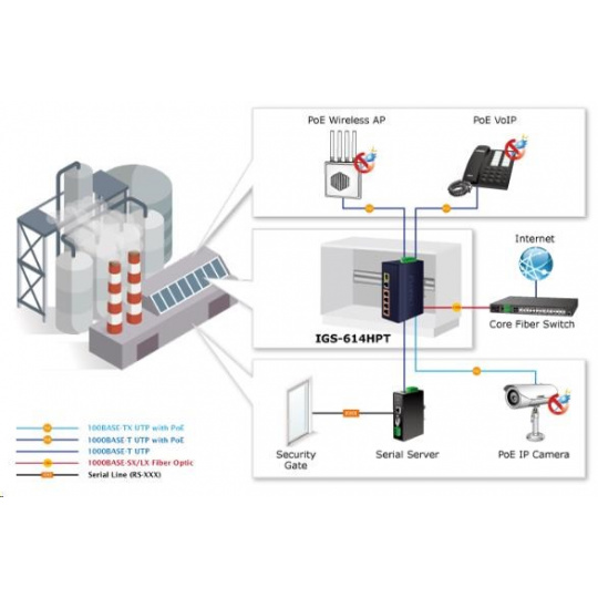 Planet IGS-614HPT, PoE switch, 5x 1000Base-T, 1x SFP, 4x PoE 802.3at, -40~+75°C, 12-56VDC, dual-power, DIN