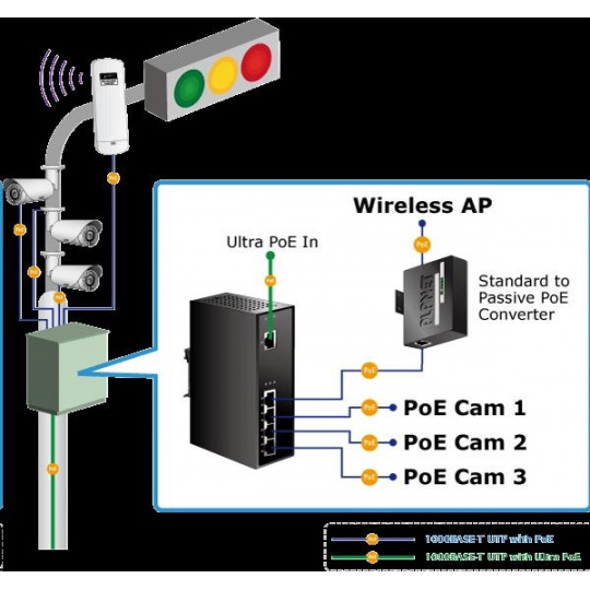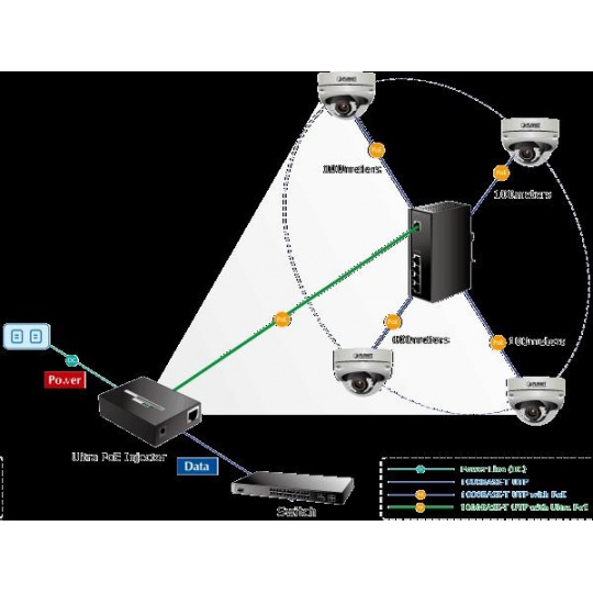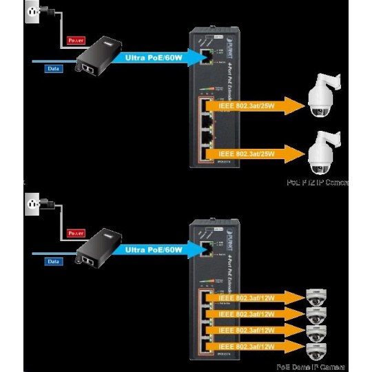 Priemyselný extender Power over Ethernet IEEE 802.3at so 4-portovým gigabitovým prepínačom a injektormi na dodatočné napájanie zariadení cez Ethernet. Injektory je možné zaťažovať až do 60 W v kombinácii 2x 802.3at s výkonom 30 W alebo 4x 802.3af pri 12 W. Určené na použitie s kamerami PTZ, dotykovými monitormi, zariadeniami VoIP alebo prístupovými bodmi WiFi v teréne a na ťažko prístupných miestach. Extender je možné prevádzkovať pri teplotách od -40 do 75 °C a je odolný voči vibráciám, preťaženiu a vonkajším mechanickým vplyvom; všetky porty obsahujú ochranu ESD+EFT proti prepätiu a elektrostatike. Extender je napájaný priamo z injektora PoE UltraPower (60 W) Planet POE-171 alebo POE-173! Parametre: - ethernetové rozhranie: 1x vstup PoE (Ultra Power 60W); 4x injektory - celková zaťažiteľnosť injektorov 60W (2x 30W alebo 4x 12W) - kompatibilné s IEEE 802.3u, IEEE 802.3ab 1000Base-T, IEEE 802.3af, IEEE 802.3at - instalace na DIN lištu nebo na zeď, montážní díl součástí - krytí IP30, skříň celohliníková - zařízení je odolné proti pádu (IEC-60068-2-32) z výšky 75cm na všechny dopadové části - zařízení je odolné proti vibracím (IEC-60068-2-6) 10-500-10Hz, 4x g, 0,5oct/min - zařízení je odolné proti přetížení krátkodobému zrychlení 50x g, dlouhodobému 4x g (IEC-60068-2-27) - integrována ochrana EFT/ESD proti zavlečení cizího napětí a proti rychlým přechodovým jevům do 6KV DC - EMI/EMS, elektromagnetická kompatibilita a slučitelnost dle CE EN-6100-4-2,3,4,5,6 - elektrická bezpečnost dle CE EN-60950 - LED indikace zatížení - pracovní teplota -40 až 75°C, vlhkost do 95% - rozměry: 135 x 87.8 x 56 mm - hmotnosť 715 g - napájanie PoE IEEE 802.3at, 60W injektor UltraPower (Planet POE-171 alebo POE-173)..