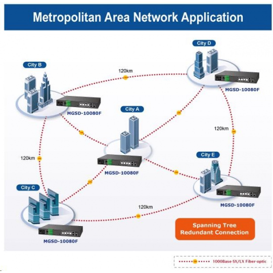 Spravovaný viacportový optický prepínač SFP navrhnutý pre rozsiahle siete, telekomunikácie a aplikácie ISP alebo IPTV. Vďaka svojej fyzickej a odolnej konštrukcii je vhodný na priamu inštaláciu do smerových alebo koncových skríň. Zariadenie pracuje v teplotnom rozsahu od -10 do 60 °C, môže byť napájané redundantne, má digitálne I/O rozhranie a všetky porty sú prístupné z predného panela. Prepínač možno spravovať prostredníctvom protokolov IPv4 a IPv6, SNMPv3 a bezpečne na šifrovanej vrstve SSL/SSH. Medzi funkcie patrí integrácia do dátových centier alebo pripojenie a zabezpečenie prevádzky koncových používateľov, riadenie prevádzky na základe QoS, filtrovanie a autorizácia prístupov prostredníctvom zoznamu ACL (Access Control List), aktivácia fyzického portu na základe autentifikácie na serveri RADIUS pomocou IEEE 802.1x. Vlastnosti 8x 100/1000Base-SX/LX/BX/FX SFP rozhraní, podpora SFP-DDM (Digital Diagnostic Monitor) 2x 1000Base-T, Switching, Full Duplex (1000/2000 Mbps), Auto-Negotiation (10/100/1000 Mbps), sdílených s SFP porty Plná podpora protokolu IPv6/IPv4 8k MAC adres, sdílený buffer 4Mbit Propustnost: sběrnice 20Gbps, 14,8Mp/s(64B) Podpora přenosu Jumboframe 9KB Provedení rackmount, rozměry (330 x 155 x 43,5)mm, hmotnost 1,6kg, 1U výška Napájení: duálně AC 100~240V/50Hz; DC -36V až -72V; příkon do 11W 2x digitální vstupy (zátěž 10mA)+2x výstupy(zátěž 100mA), úrovně 0-24V Provozní teplota: -10 až 60°C Administrace Web/Telnet/konzole/SNMP s možností zabezpečeného přístupu SSH/SSL SNMP v1,v2c,v3 Funkce administrace nastavení režimu fyzické práce portů 255 sítí VLAN 802.1Q, trunking, možnosť nastaviť vstupný filter VLAN tagged/untagged paketov IP ACL, filtrovanie prevádzky podľa IP adresy, protokolu, portu, TCP príznakov, DSCP MAC ACL, filtrovanie prevádzky podľa MAC adresy, podľa VLAN ID a kombinácie príznakov priority Port shaper - nastavenie v rozsahu 500kb/s-1Gb/s QoS prioritizácia prevádzky podľa 802.1p a podľa ToS/DSCP v IP pakete, možnosť nastaviť obmedzenie odosielaných paketov na port a podľa pravidiel QoS Podpora IP multicast, IGMP, možnosť ovládať multicast priamo prepínačom (zapnúť/vypnúť multicast), IGMP v1/v2/v3; režim IGMP Query Zrkadlenie portov Port trunking IEEE 802.3ad LAPC: 5 skupín, max. 8 portov Spanning Tree IEEE 802.1d, Rapid Spanning Tree IEEE 802.1w, viacnásobný rozprestierajúci sa strom IEEE 802.1s IEEE 802.1x RADIUS - viazanie IP+MAC, VLAN + MAC DHCP Snooping na blokovanie nevhodných DHCP serverov LLDP IEEE 802.1ab - automatická detekcia typu pripojených zariadení..