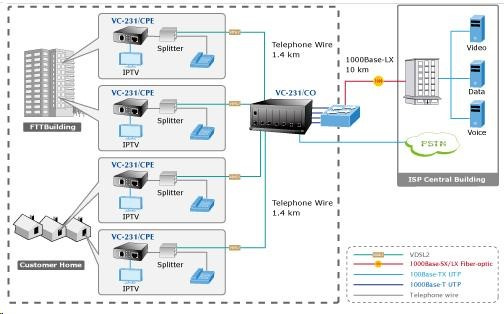 Výkonný konvertor LRE (Long Reach Ethernet) Ethernet na VDSL2 (Very-high-data-rate Digital Subscriber Line 2) umožňuje prenášať dáta cez symetrický pár vodičov rýchlosťou až 100 Mb/s na vzdialenosť 300 m alebo 50/2 Mb/s na vzdialenosť až 1,4 km. Zariadenie je univerzálne ako jednotka master (CO) / slave (CPE), režim sa nastavuje prepínačom. Jednotka podporuje prevádzkové režimy VDSL2 "17a" a "30a", ako aj "band Plan997", ktoré ovplyvňujú symetrický prenos dát pri vyšších rýchlostiach. Pomocou externého rozdeľovača je možné zachovať hlasovú službu na telefónnej linke bez ďalších úprav kabeláže; dátová prevádzka sa jednoducho pridá k existujúcej hlasovej prevádzke. Je teda možné používať telefónne káblové vedenia pôvodne určené nielen na pripojenie k účastníkom, ale aj medzi analógovými ústredňami. ISP (poskytovateľ internetových služieb) tak môže ponúkať multimediálne služby, VOD (video na požiadanie), VoIP (hlas cez IP), videotelefón, IPTV atď. Smerovač možno úspešne prevádzkovať cez linky VDSL spoločnosti O2. Vlastnosti: - 1 port VDSL, konektor RJ-11 - 1 port LAN 10/100Base-TX, prepínanie, plný duplex (100/200 Mb/s), automatické vyjednávanie (10/100 Mb/s) - prenos paketov do 1536 bajtov - transparentný pre IEEE 802.1Q VLAN tag - parametre nastavené prepínačmi DIP na zariadení: výber CPE/CO, výber modulácie, výber komunikačného limitu, výber SNR - podpora štandardov: IEEE 802.3, 10Base-T, IEEE 802.3u, 100Base-TX, IEEE 802.3x - spĺňa štandardy VDSL ITU-T G.993.1, ITU-T G.997.1, ITU-T G.993.2 - rozměry 90x70x26mm - hmotnost: 199g - externí zdroj 5V/2A - provozní teplota okolí: 0 až 50°C - lze instalovat do modelů šasi: MC-700 / MC-1500/ MC-1500R Dosahy a rychlosti na vedení s vodiči AWG24 a lepších: > 17a profil (Downstream / Upstream) - 200m -> 86/65Mbps - 400m -> 86/52Mbps - 600m -> 81/36Mbps - 800m -> 72/19Mbps - 1000m -> 60/9Mbps - 1200m -> 59/6Mbps - 1400m -> 49/2Mbps > 30a profil (Downstream / Upstream) - 300m -> 100/100Mbps - 400m -> 90/90Mbps - 600m -> 61/40Mbps - 800m -> 54/8Mbps Nastavení pro O2 VDSL připojení - modem v režimu CPE; další DIP přepínače FEC, VDSL profil, SNR podle kvality linky (standardně FEC=Fast, VDSL=30a, SNR=9dB) - v routeru na WAN rozhraní aplikovat VLAN ID:848 - nad WAN nastavit PPPoE klienta, Login: O2/O2 - dále věnujte pozornost nastavení vašeho router, jeho firewallu, přístupových práv, UPnP, atd...