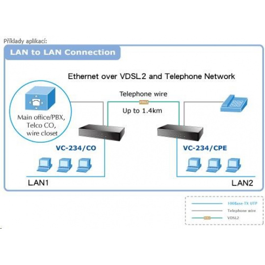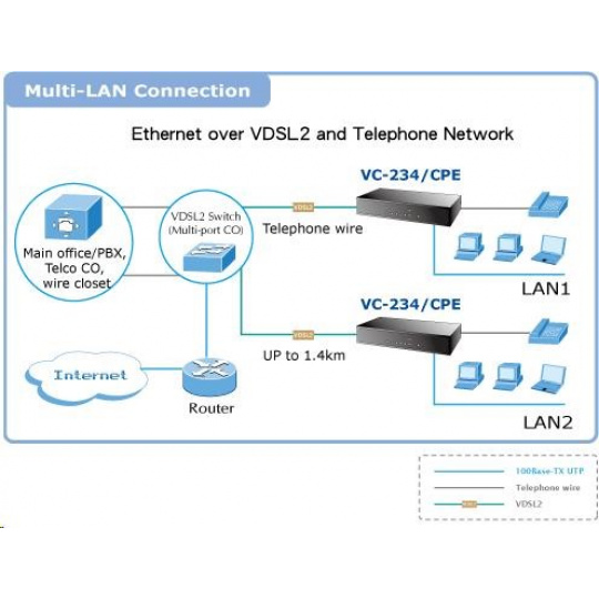 Ethernet cez telefónnu linku (technológia VDSL2). 4x LAN RJ-45, 2x RJ-11 konektor pre VDSL2 a POTS. 100/100 Mb/s na vzdialenosť 300 m.Priehľadný most. Dosah až 1,4 km. Nastavenie prepínača DIP. Voliteľný Master (CO) / Slave (CPE). Zabudovaný rozdeľovač. Výkonný konvertor LRE (Long Reach Ethernet) Ethernet na VDSL2 (Very-high-data-rate Digital Subscriber Line 2) umožňuje prenášať dáta cez symetrický pár vodičov rýchlosťou až 100 Mb/s na vzdialenosť 300 m alebo 20/4 Mb/s na vzdialenosť až 1,4 km. Integrovaný rozdeľovač zachováva hlasovú službu na telefónnej linke bez ďalších úprav zapojenia, dátová prevádzka sa jednoducho pridá k existujúcej hlasovej prevádzke. Je teda možné používať telefónne káblové vedenia pôvodne určené nielen na pripojenie k účastníkom, ale aj medzi analógovými ústredňami. ISP (poskytovateľ internetových služieb) tak môže ponúkať multimediálne služby, VOD (video na požiadanie), VoIP (hlas cez IP), videotelefón, IPTV atď. Zariadenie je univerzálne ako jednotka master (CO) / slave (CPE), režim sa nastavuje prepínačom. Jednotka podporuje prevádzkové režimy VDSL2 "17a" a "30a", ako aj "band Plan997", ktoré ovplyvňujú symetrický prenos dát pri vyšších rýchlostiach. Vlastnosti: - 2x RJ-11 port pre VDSL a POTS (Plain Old Telephone Service) - 4x LAN 10/100Base-TX, prepínanie, plný duplex (100/200 Mbps), automatické vyjednávanie (10/100 Mbps) - transparentný pre IEEE 802.1Q VLAN tag - parametre nastavené prepínačmi DIP na zariadení: výber CPE/CO, výber modulácie, výber komunikačného limitu, výber SNR - podpora štandardov: IEEE 802.3, 10Base-T, IEEE 802.3u, 100Base-TX, IEEE 802.3x - spĺňa štandardy VDSL ITU-T G.993.1, ITU-T G.997.1, ITU-T G.993.2 - Rozmery: 155 x 86 x 26 mm - Hmotnosť: 368 g - Externé napájanie 5V/2A - Prevádzková teplota: 0 až 50 °C Rozsah a rýchlosti na vedeniach s vodičmi AWG24 a lepšími: > profil 17a (Downstream / Upstream) - 200m -> 99/70Mbps - 400m -> 99/60Mbps - 600m -> 90/45Mbps - 800m -> 50/28Mbps - 1000m -> 40/12Mbps - 1200m -> 20/7Mbps - 1400m -> 20/4Mbps > profil 30a (Downstream / Upstream) - 300m -> 100/100Mbps - 400m -> 90/90Mbps - 600m -> 69/55Mbps - 800m -> 48/9Mbps..