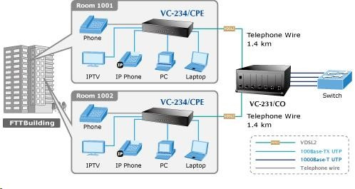 Planet VC-234, Eth. VDSL2 konvertor, 100Mbit, master/slave, 2x RJ-11, splitter, 4x RJ-45