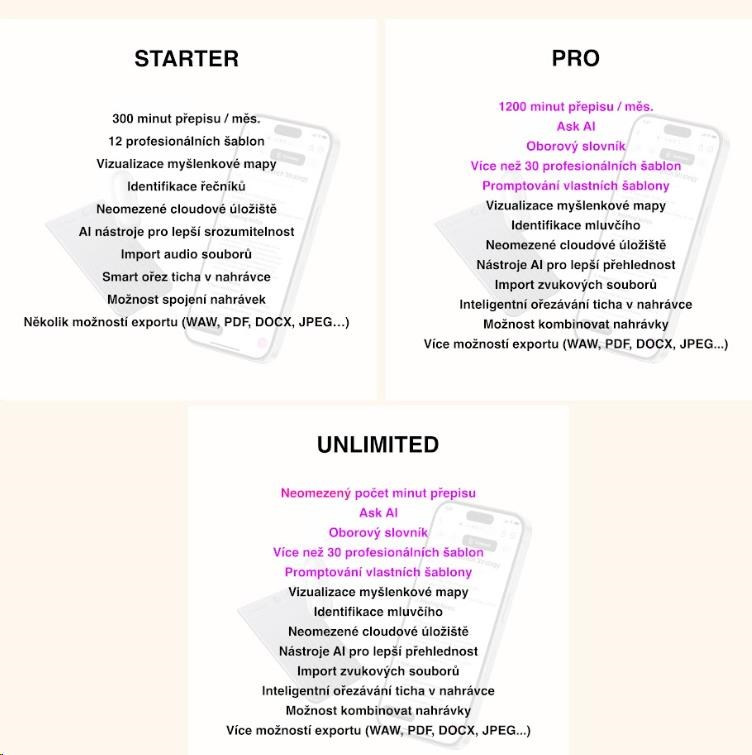 • Váš 3 v 1 asistent: Záznam, přepis, souhrn. 300 minut měsíčně zdarma