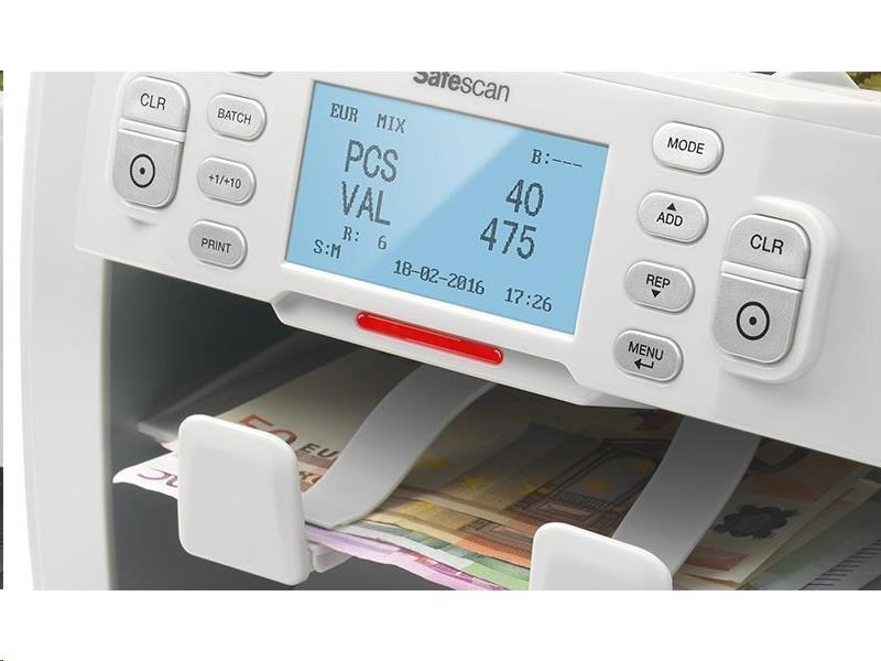 - Počítačka Safescan 2985-SX je skvelým pomocníkom pri efektívnom a rýchlom počítaní, triedení a overovaní bankoviek. - Vďaka konštrukcii s dvoma výstupnými priehradkami a technológii CIS dokáže počítačka počítať aj hodnoty najmodernejších typov bankoviek, ako sú bankovky vytlačené na polyméroch, s priehľadnými okienkami alebo s takmer rovnakými nominálnymi hodnotami. - Počítačka je určená na veľké množstvá bankoviek a je ideálna pre veľké podniky, ktoré potrebujú rýchle a bezchybné počítanie viacerých mien s detekciou pravosti. - Šetrí čas a eliminuje chyby pri počítaní. - Veľký zásobník pojme až 300 bankoviek a počíta s tromi rôznymi rýchlosťami, čím poskytuje maximálnu flexibilitu. - Počíta triedené bankovky akejkoľvek meny a netriedené bankovky CZK, EUR, GBP, CHF, USD, PLN, BGN. - 8-bodová detekcia falzifikátov - UV, magnetické a infračervené prvky, kovový povlak, vodoznak, farba, veľkosť a hrúbka. - 4 štandardné meny na detekciu a počítanie: GBP, EUR, USD a CHF. - Počas procesu počítania zostávajú podozrivé bankovky v susednej výstupnej priehradke, zatiaľ čo počítanie pokračuje. - Automatické rozpoznávanie meny a nominálnej hodnoty. - Triedi a otáča bankovky v dvoch výstupných priehradkách pomocou modernej technológie CIS. - Dokáže skenovať sériové čísla bankoviek. - Vhodné pre polymérové bankovky a nové bankovky série Európa...