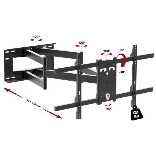 Poctivý držiak na televízor Ergosolid ONYX-30 Kvalitný nástenný držiak na TV 43-90", výsuvný 80-915mm, otočný +/-65°, náklon +5°/-10°, korekcia roviny +/-5°, VESA 200x100 až 800x400, nosnosť 50kg Nástenný držiak poctivej konštrukcie pre spoľahlivé zavesenie všetkých typov a značiek televízorov. Držiak Vám umožní televíziu nastaviť od steny do vzdialeností v rozmedzí 80mm až 915mm. Otáčanie do strán bude možné minimálne o 60° na každú stranu, náklon je možný v rozmedzí +5°až -10°. Pre uľahčenie inštalácie má držiak možnosť korekcie roviny obrazovky až o 5° na každú stranu. Celá konštrukcia držiaka je vyrobená z poctivej ocele a ani pri maximálnom vysunutí a maximálnom zaťažení nevznikajú žiadne voľné a nedochádza k provešeniu ramien. Inštalačná nástená plocha s rozmermi 455x255mm je dostatočne veľká pre spoľahlivé uchytenie na stenu a výborné rozloženie celkovej hmotnosti na väčšiu plochu. Držiak podporuje VESA štandardy 200x100 až 800x400 a zavesiť na neho môžete televízory s hmotnosťou až 50kg. Farba je čierna. Na držiak poskytujeme záruku 5 rokov. Nástenný extra dlhý výsuvný držiak poctivej konštrukcie na televízie 43-90" Ergosolid ONYX-30 Technické údaje: nosnosť 50kg podporuje VESA 200x100 až 800x400 ideálny na televízory s uhlopriečkou 43" až 90" nastaviteľná vzdialenosť od steny 80mm až 915mm otočenie na obe strany až +/- 60° nakláňanie dolu až o 10° alebo hore až o 5° korekcia roviny obrazovky až +/- 5° inštalačná plocha o rozmeroch 455x255mm vynikajúca kvalita oceľová silnostenná konštrukcia inštalačný materiál je súčasťou balenia farbené prevedenie čierne záruka 5 rokov Kvalitná konštrukcia a naozaj rozsiahla možnosť polohovania sú prednosťou televízneho držiaku Ergosolid ONYX-30 TV držiak Ergosolid ONYX-30 podporuje tieto VESA štandardy: VESA 200x100 VESA 200x200 VESA 300x200 a 200x300 VESA 300x300 VESA 400x200 a 200x400 VESA 400x300 a 300x400 VESA 400x400 VESA 600x400 VESA 800x400 Na televízny držiak Ergosolid ONYX-30 môžete zavesiť všetky typy, značky a veľkosti televízorov, ktoré majú hmotnosť maximálne 50kg a ktoré podporujú ktorýkoľvek z vyššie uvedených VESA štandardov. Univerzálny držiak na LCD LED plazma OLED QLED televízie 43-90" Ergosolid ONYX-30 V balení nájdete tento inštalačný materiál: šrouby M4x14mm 4ks šrouby M6x14mm 4ks šrouby M6x30mm 4ks šrouby M8x20mm 4ks šrouby M8x45mm 4ks malé distančné válečky 4ks veľké distančné válečky 4ks univerzálne podložky 4ks podložky na šrouby 5ks vruty do hmoždiniek 8x60mm 5ks hmoždinky O10x50mm 5ks stahovacie pásky na suchý zips 2ks (fixácia káblov na držiaku) Televízny držiak poctivej konštrukcie a vynikajúcej kvality Ergosolid ONYX-30 dodávame vrátane inštalačného materiálu Držiaky TV Ergosolid ONYX-30 poskytujú veľkú variabilitu polohovania obrazovky, vynikajúce spracovanie a úplne bezpečné zavesenie televízora za dostupnú cenu. Tieto držiaky vydržia naozaj mnoho rokov bez nutnosti akýchkoľvek opráv a vďaka univerzálnosti sú vhodné aj v prípade zakúpenia novej televízie. Stanú sa súčasťou Vášho domova.
