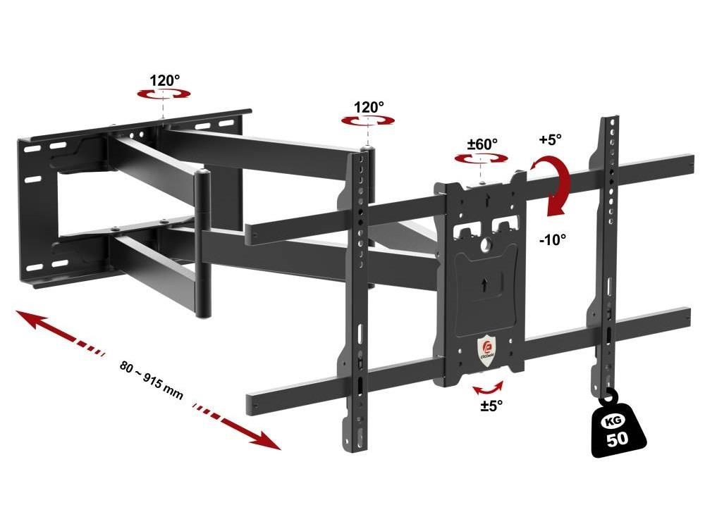 Poctivý držiak na televízor Ergosolid ONYX-30 Kvalitný nástenný držiak na TV 43-90", výsuvný 80-915mm, otočný +/-65°, náklon +5°/-10°, korekcia roviny +/-5°, VESA 200x100 až 800x400, nosnosť 50kg Nástenný držiak poctivej konštrukcie pre spoľahlivé zavesenie všetkých typov a značiek televízorov. Držiak Vám umožní televíziu nastaviť od steny do vzdialeností v rozmedzí 80mm až 915mm. Otáčanie do strán bude možné minimálne o 60° na každú stranu, náklon je možný v rozmedzí +5°až -10°. Pre uľahčenie inštalácie má držiak možnosť korekcie roviny obrazovky až o 5° na každú stranu. Celá konštrukcia držiaka je vyrobená z poctivej ocele a ani pri maximálnom vysunutí a maximálnom zaťažení nevznikajú žiadne voľné a nedochádza k provešeniu ramien. Inštalačná nástená plocha s rozmermi 455x255mm je dostatočne veľká pre spoľahlivé uchytenie na stenu a výborné rozloženie celkovej hmotnosti na väčšiu plochu. Držiak podporuje VESA štandardy 200x100 až 800x400 a zavesiť na neho môžete televízory s hmotnosťou až 50kg. Farba je čierna. Na držiak poskytujeme záruku 5 rokov. Nástenný extra dlhý výsuvný držiak poctivej konštrukcie na televízie 43-90" Ergosolid ONYX-30 Technické údaje: nosnosť 50kg podporuje VESA 200x100 až 800x400 ideálny na televízory s uhlopriečkou 43" až 90" nastaviteľná vzdialenosť od steny 80mm až 915mm otočenie na obe strany až +/- 60° nakláňanie dolu až o 10° alebo hore až o 5° korekcia roviny obrazovky až +/- 5° inštalačná plocha o rozmeroch 455x255mm vynikajúca kvalita oceľová silnostenná konštrukcia inštalačný materiál je súčasťou balenia farbené prevedenie čierne záruka 5 rokov Kvalitná konštrukcia a naozaj rozsiahla možnosť polohovania sú prednosťou televízneho držiaku Ergosolid ONYX-30 TV držiak Ergosolid ONYX-30 podporuje tieto VESA štandardy: VESA 200x100 VESA 200x200 VESA 300x200 a 200x300 VESA 300x300 VESA 400x200 a 200x400 VESA 400x300 a 300x400 VESA 400x400 VESA 600x400 VESA 800x400 Na televízny držiak Ergosolid ONYX-30 môžete zavesiť všetky typy, značky a veľkosti televízorov, ktoré majú hmotnosť maximálne 50kg a ktoré podporujú ktorýkoľvek z vyššie uvedených VESA štandardov. Univerzálny držiak na LCD LED plazma OLED QLED televízie 43-90" Ergosolid ONYX-30 V balení nájdete tento inštalačný materiál: šrouby M4x14mm 4ks šrouby M6x14mm 4ks šrouby M6x30mm 4ks šrouby M8x20mm 4ks šrouby M8x45mm 4ks malé distančné válečky 4ks veľké distančné válečky 4ks univerzálne podložky 4ks podložky na šrouby 5ks vruty do hmoždiniek 8x60mm 5ks hmoždinky O10x50mm 5ks stahovacie pásky na suchý zips 2ks (fixácia káblov na držiaku) Televízny držiak poctivej konštrukcie a vynikajúcej kvality Ergosolid ONYX-30 dodávame vrátane inštalačného materiálu Držiaky TV Ergosolid ONYX-30 poskytujú veľkú variabilitu polohovania obrazovky, vynikajúce spracovanie a úplne bezpečné zavesenie televízora za dostupnú cenu. Tieto držiaky vydržia naozaj mnoho rokov bez nutnosti akýchkoľvek opráv a vďaka univerzálnosti sú vhodné aj v prípade zakúpenia novej televízie. Stanú sa súčasťou Vášho domova.