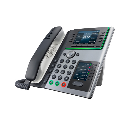 | Správa zabezpečenia | Podpora syntaxe URL s heslom; TLS (Transport Layer Security); Šifrovanie Wi-Fi: WEP, WPA-Personal, WPA2-Personal, WPA2-Enterprise s 802.1x (EAP-TLS, PEAP-MSCHAPv2); Šifrovanie médií SRTP pomocou 256-bitového šifrovania AES Poskytovanie prostriedkov Poly Zero Touch; Poly Lens; Cloudová správa služby správy zariadení Polycom pre poskytovateľov služieb (PDMS-SP); SDP Podpora znakov Unicode UTF-8; Nastaviteľný stojan na stôl (2 pozície); |