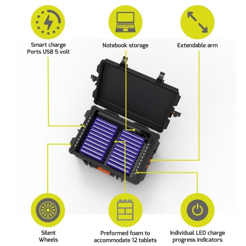 Najefektívnejšie riešenie pre nabíjanie 20 tabletov a 1 notebooku počas prepravOriginálny bezpečnostný kufr s funkciou dobíjania.