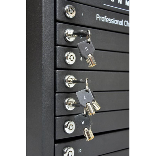 Originálna napájacia skrinka s funkciou dobíjania a individuálnych zámkov pre každé zariadenie zvlášť.