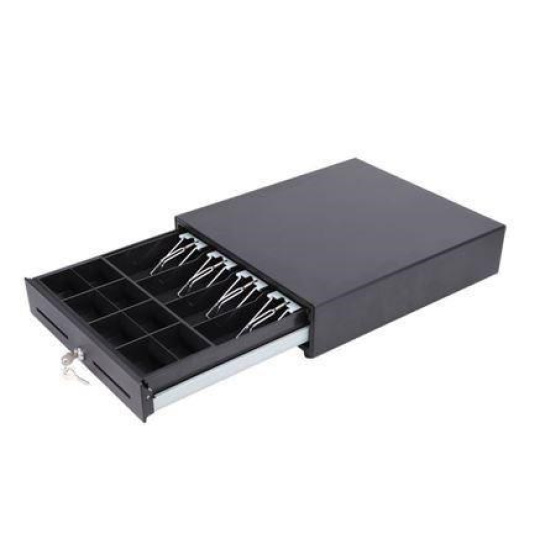 - Kovová pokladní zásuvka s kuličkovým ložiskem pro velké zatížení - Ocelová konstrukce - Včetně přihrádky na bankovky: Nastavitelné přepážky až pro 4 přihrádky (se 4 kovovými sponami) - Včetně přihrádky na mince: Dvouřadá s nastavitelnými přepážkami pro 8 přihrádek - Otvor pro média s předním přístupem pro šek, potvrzení o kreditní kartě nebo jakýkoli papír - 3-polohový zámek kláves - 6V, 12V, 24V pro rozhraní tiskárny účtenek RJ11 / RJ12