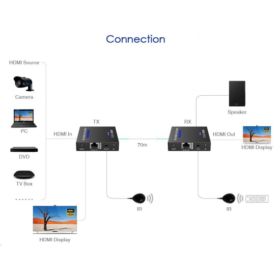 - Konektory na vysielači: Vstup HDMI, Výstup HDMI pre miestny monitor, konektor RJ45, napájací konektor, 1x IR konektor