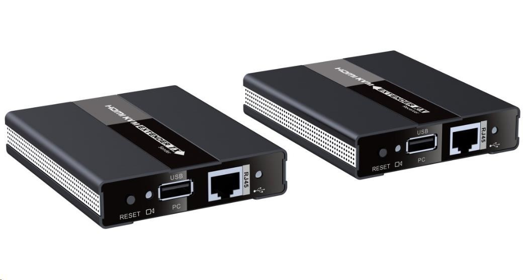 - Extender prenáša aj USB, vysielač má jeden USB na pripojenie k počítaču, prijímač má dva USB konektory na pripojenie napr. myši a klávesnice
