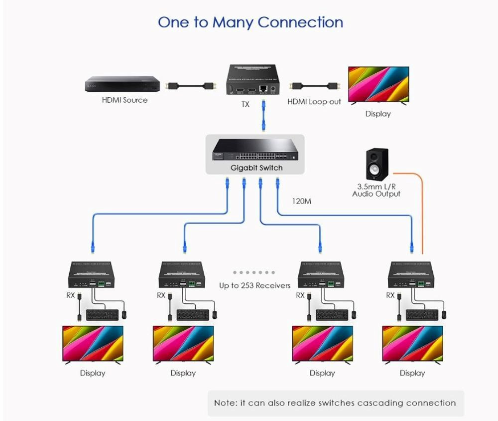 - Extender umožňuje použitie jedného vysielača a viacerých prijímačov vzájomne prepojených pomocou LAN siete, switchov a routerov (testované na 4k@60Hz a FULL HD 1080p a 60m kábli + switch + 2 prijímače) táto počítačová sieť musí byť vyhradená iba pre HDMI extendery, nesmie zdieľať ďalšie počítače, tlačiarne a iné sieťové zariadenia.