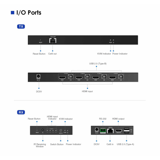 - KVM prepínač (transmitter) sa prepojí kvalitným káblom Cat6/7 na vzdialenosť až 70m s receiverom