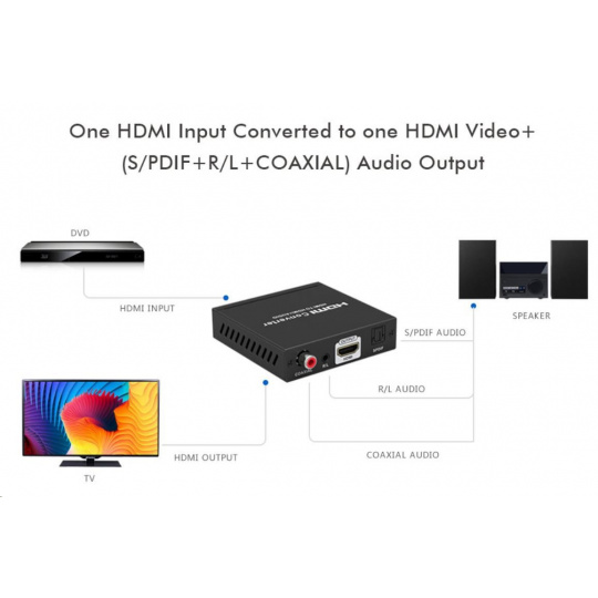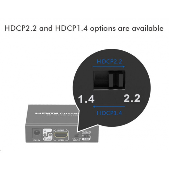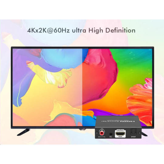 Umožňuje oddelenie zvuku z HDMI2.0 vstup na analógový/digitálny zvuk, ktorý je samostatne vyvedený do konektorov: stereo jack, digitálny audio RCA CINCH alebo digitálny optický TOSLINK (SPDIF)