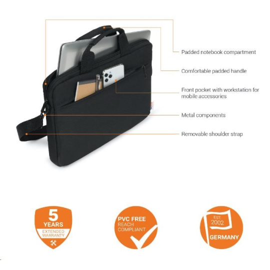 Product Description Your notebook will arrive at its destination safely with the BASE XX slim case. The main compartment is furnished with particularly thick padding, which means your device is completely protected from bumps and shocks. Documents and mobile accessories such as your smartphone, business cards, pens and so on are always within easy reach in the zip pocket on the front. The length-adjustable and removable shoulder strap and handle make the bag very easy to carry. BASE XX emphasises the durability of the product with an extended five year guarantee. Padded notebook compartment Front pocket with workstation for mobile accessories All around padding for extra protection High quality metal components Comfortable carrying handle and removable shoulder strap Picture may differ slightly from the original Additional Information Product Dimensions 360 x 260 x 35 mm EAN 7640186417242 Material 300Dx300D Polyester Colour olive green