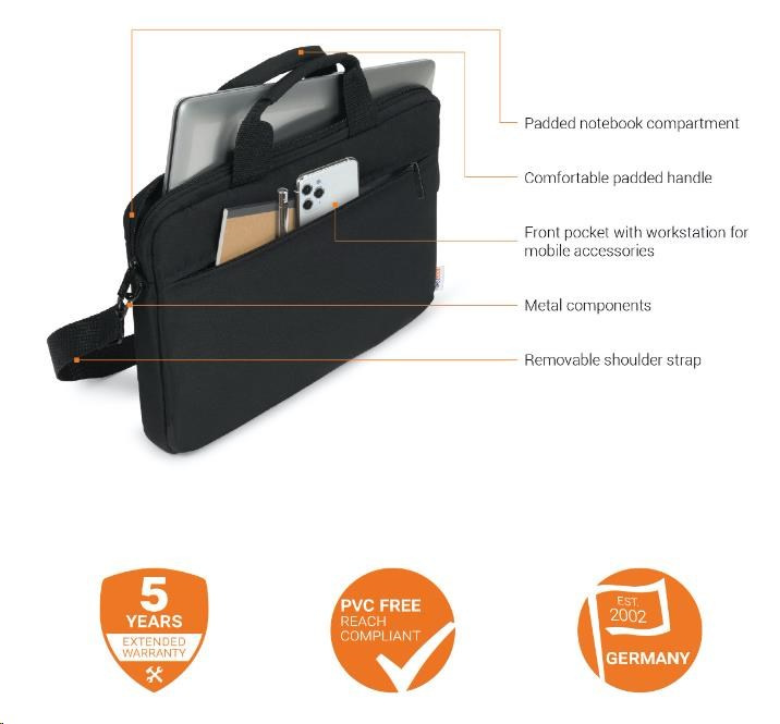 Product Description Your notebook will arrive at its destination safely with the BASE XX slim case. The main compartment is furnished with particularly thick padding, which means your device is completely protected from bumps and shocks. Documents and mobile accessories such as your smartphone, business cards, pens and so on are always within easy reach in the zip pocket on the front. The length-adjustable and removable shoulder strap and handle make the bag very easy to carry. BASE XX emphasises the durability of the product with an extended five year guarantee. Padded notebook compartment Front pocket with workstation for mobile accessories All around padding for extra protection High quality metal components Comfortable carrying handle and removable shoulder strap Picture may differ slightly from the original Additional Information Product Dimensions 360 x 260 x 35 mm EAN 7640186417242 Material 300Dx300D Polyester Colour olive green.