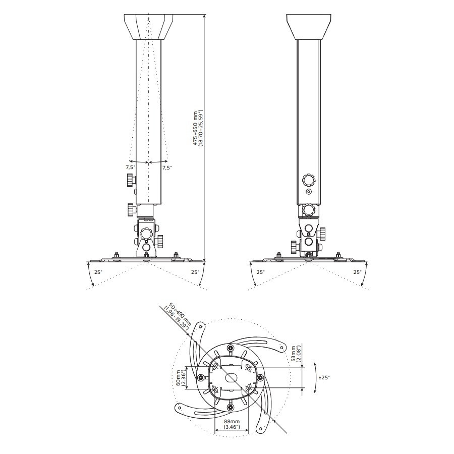 Profesionálny dizajnový stropný držiak na projektor EDBAK PMV100 Stropný držiak na zavesenie projektora s hmotnosťou do 15kg, najvyššia kvalita, dizajn, nastaviteľnosť 45-65cm Nie vždy je možné použiť obyčajný stropný držiak na projektory, niekedy je potrebné použiť držiaky najvyššej kvality a krásneho dizajnu. My vám takéto držiaky na projektory ponúkame. Komplexná rada profesionálnych stropných držiakov na projektory v nádhernom dizajnovom prevedení. Držiaky sú úplne nastaviteľné, vhodné pre 99% dostupných projektorov a dataprojektorov. Farba čierna alebo biela. Záruka 5 rokov. Ak vám záleží na dizajne rovnako ako na kvalite, ste na správnej stránke. Profesionálny dĺžkovo nastaviteľný otáčací a sklopný stropný držiak na projektory Edbak PMV100 Technické údaje: nosnosť 15kg univerzálny držiak na uchytenie 99% dostupných projektorov na projektory s 3 alebo 4 otvormi pre uchytenie rozteč otvorov pre uchytenie v rozmedzí 50-490mm dĺžkové nastavenie 450mm až 650mm otáčanie do strán +/- 360° náklon do strán +/- 25° náklon nahor a nadol +/- 25° korekcia roviny obrazu korekcia nerovnosti stropu +/- 7,5° zaistenie v požadovanej polohe systém pre skryté vedenie káblov najvyššia kvalita - profesionálne prevedenie nádherný dizajn biele alebo čierne prevedenie záruka 5 rokov Stropné a nástenné držiaky na projektory najvyššej kvality, profesionálne Edbak PMV100 Na stropný držiak s nastavením dľžky 45-65cm EDBAK PMV100 je možné uchytiť všetky projektory, ktoré majú 3 alebo 4 otvory so závitom s roztečou 50mm až 490mm. Profesionálne stropné alebo nástenné držiaky na projektory Edbak PMV100 Vďaka najvyššej kvalite a profesionálnemu prevedeniu sú držiaky EDBAK rady PMV vhodné naozaj kamkoľvek.